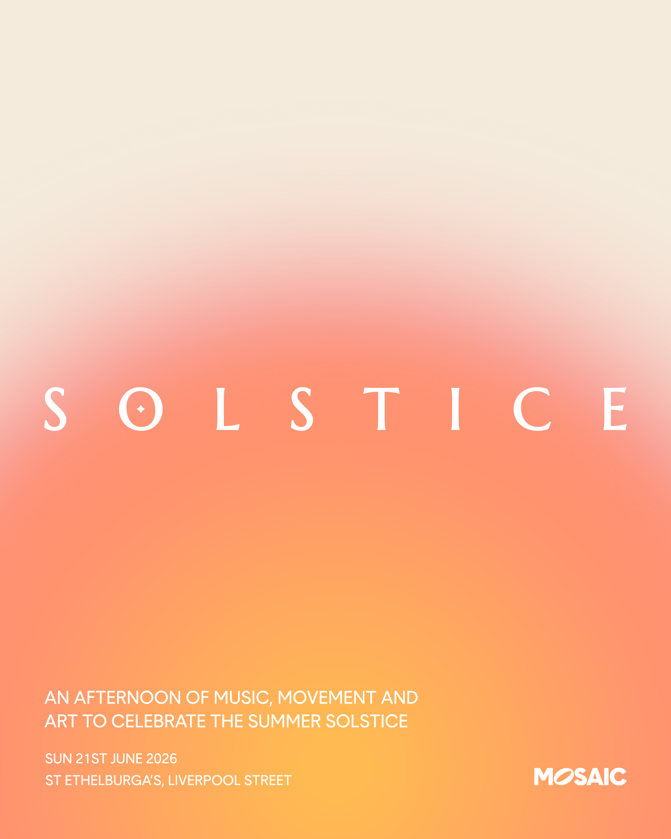MOSAIC is inviting you to a celebration of the longest day of the year. The Solstice offers a moment to appreciate light, nature, and time, and in that spirit we have curated an afternoon of music, movement, and art.